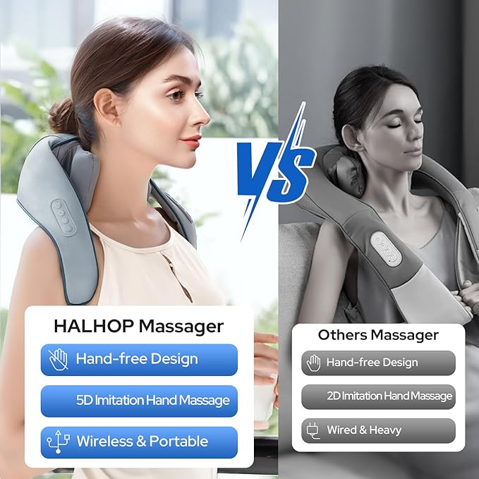- 【MULTI FUNCTIONAL】 - Halohop Shoulder & Neck Massager with 2 Modes, 3 Massage Styles, and 2 Temperatures. Its versatile functions offer a professional massage experience tailored to your needs. With 5D Massager Heads that realistically simulate human hand massage techniques, this massager effectively relieves muscle pain and body fatigue.