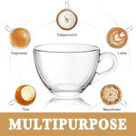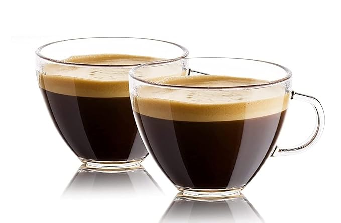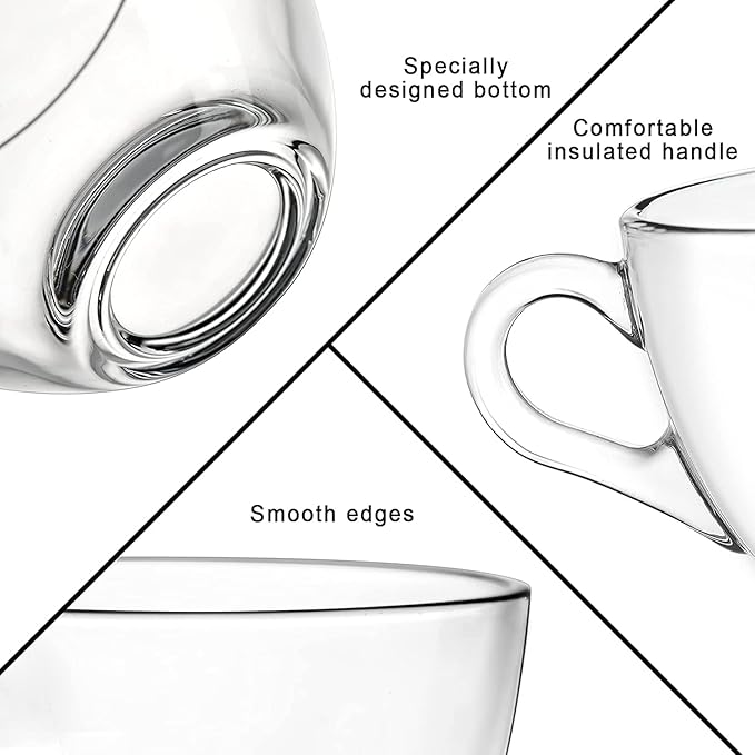 • ERGONOMICALLY SIZED: These hot coffee cups set includes highly transparent quality 6 glass mugs,full capacity coffee glass mugs of 7oz/215ml. The glass is 2.4” tall with a 3.5” wide top that won’t rock or tip. PERFECT for coffee,breakfast tea and espresso.